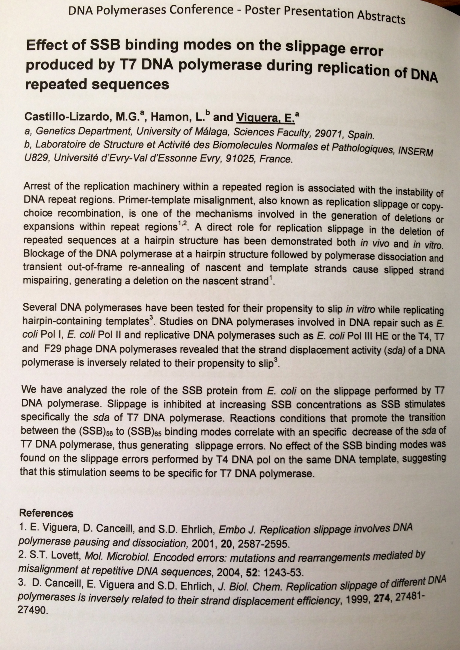 1. E. Viguera, D. Canceill, and S.D. Ehrlich, Embo J. Replication slippage involves DNA polymerase pausing and dissociation, 2001, 20, 2587-2595.