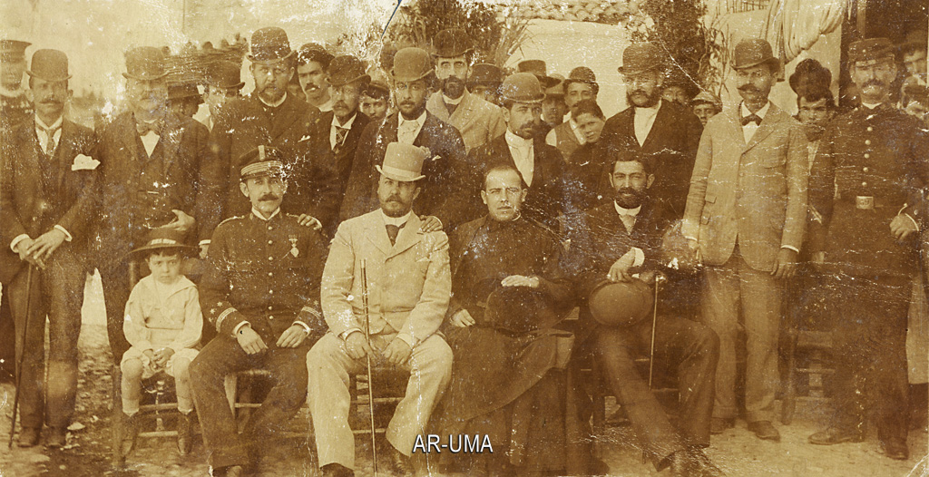 Fotografía de grupo de amigos. De Izquierda a derecha y de pie, Narciso Díaz de Escovar (3º) y Arturo Reyes (5º)