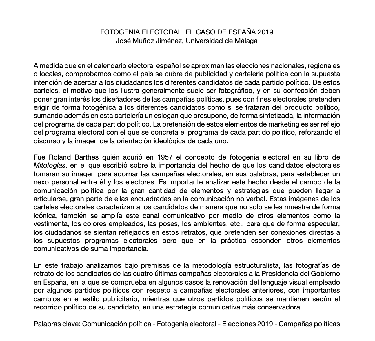 Cuando en el calendario electoral español se aproximan elecciones, comprobamos como el país se cubre de publicidad y cartelería política con la intención de acercar a la ciudadanía los diferentes candidatos de cada partido político. De estos carteles, el motivo que los ilustra generalmente suele ser fotográfico, y en su confección deben poner gran interés los diseñadores de las campañas políticas, pues con fines electorales pretenden erigir de forma fotogénica a los diferentes candidatos como producto político, sumando además en esta cartelería el eslogan que supuestamente sintetiza la información del programa de cada partido político.