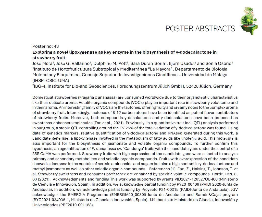 Domestical strawberries (Fragaria x ananassa) are consumed worldwide due to their organoleptic characteristics like their delicate aroma. Volatile organic compounds (VOCs) play an important role in strawberry volatilome and in their aroma. An interesting family of VOCs are the lactones, offering fruity and creamy notes to the complex aroma of strawberry fruit. Interestingly, lactones of 8-12 carbon atoms have been identified as potent flavor contributors of strawberry fruits. Moreover, both compounds γ-decalactone and γ-dodecalactone have been proposed as sweetness-enhancers molecules (Fan et al., 2021). Previously, in a quantitative trait loci (QTL) analysis performed in our group, a stable QTL controlling around the 15-25% of the total variation of γ-dodecalactone was found. Using data of genetics markers, relative quantification of γ-dodecalactone and RNAseq generated during this work, a candidate gene rise: a lipoxygenase involved in the metabolism of fatty acids like linolenic acid. This molecule is also important for the biosynthesis of jasmonate and volatile organic compounds. To further confirm this hypothesis, an agroinfiltration of F. x ananassa cv. ‘Candonga’ fruits with the candidate gene under the control of a 35S CaMV was performed. Strawberry fruits with high expression of the candidate gene were selected to analyze primary and secondary metabolites and volatile organic compounds. Fruits with overexpression of the candidate showed a decrease in the contain of certain aminoacids and sugars but also a high content in γ-dodecalactone and methyl jasmonate as well as other volatile organic compounds.