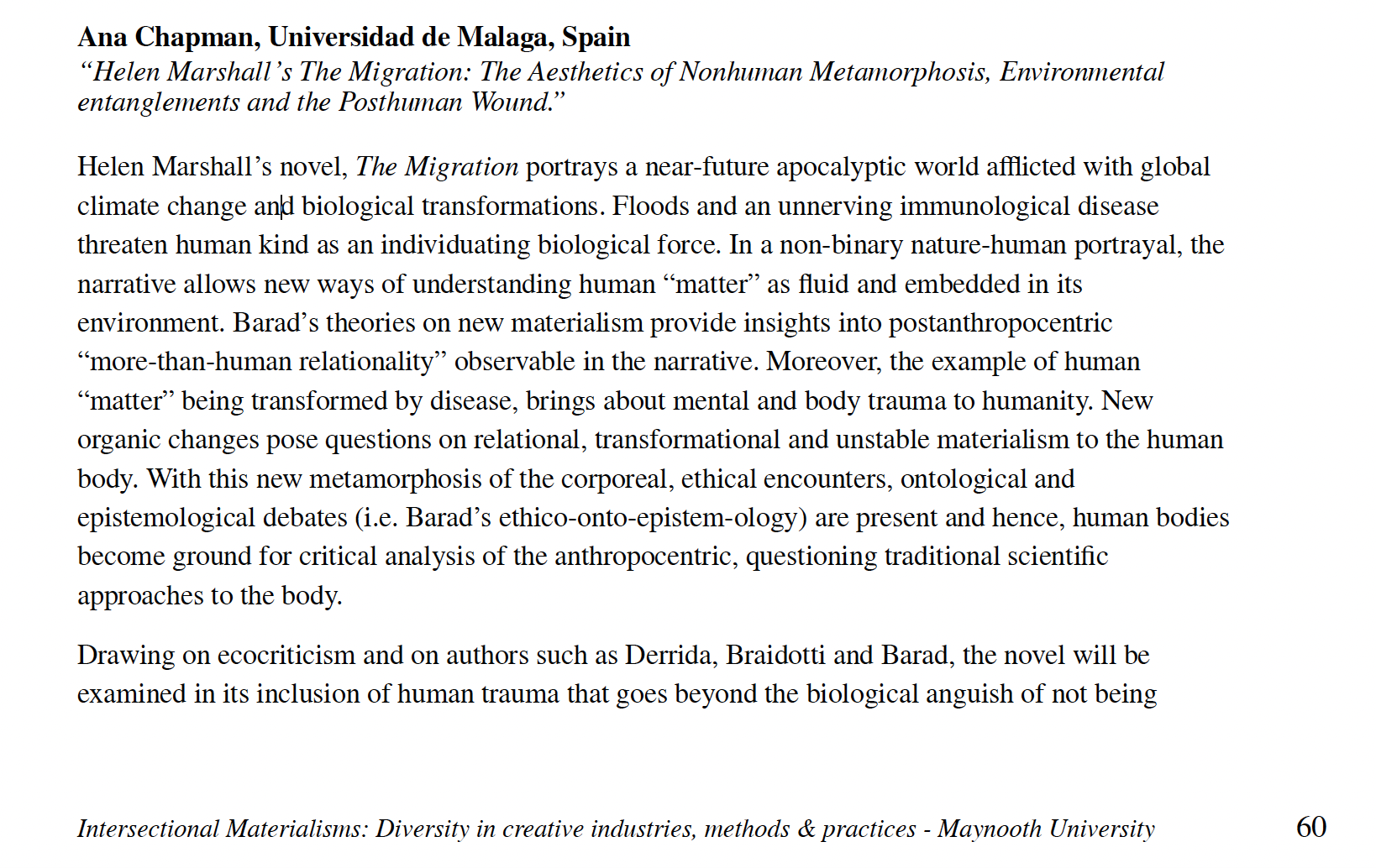 Helen Marshall’s novel, The Migration portrays a near-future apocalyptic world afflicted with global climate change and biological transformations. Floods and an unnerving immunological disease threaten human kind as an individuating biological force. In a non-binary nature-human portrayal, the narrative allows new ways of understanding human “matter” as fluid and embedded in its