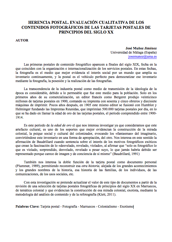 Con esta investigación se pretende actualizar el valor de este tipo de documentos a partir de la revisión de una selección de tarjetas postales de principios del siglo XX sobre Marruecos, mediante la metodología del análisis de contenido y de la refotografía (Klett, 2011).