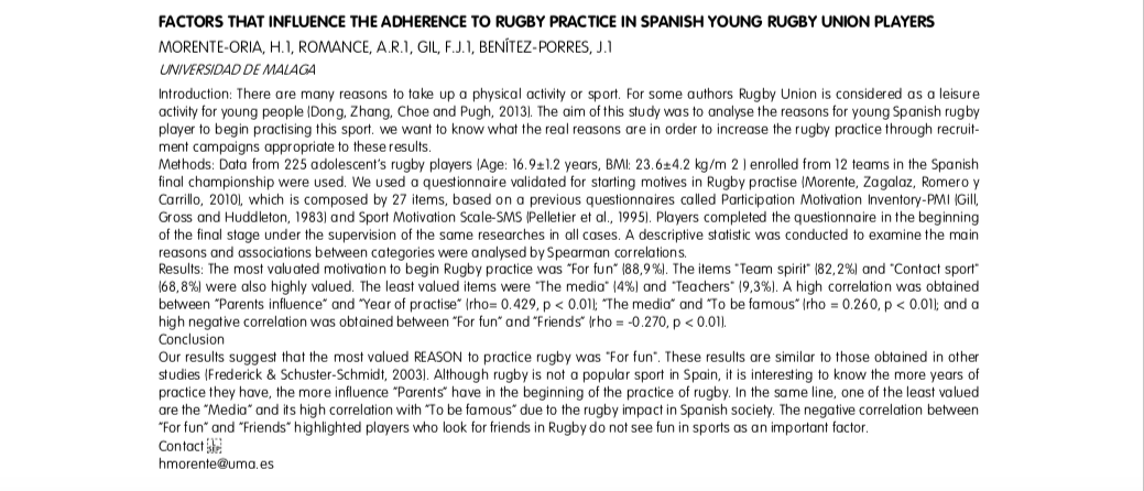 Morente-Oria, H., Romance-García A.R., Gil-Espinosa F.J., Benítez-Porres, J. (2018). Factors that influence the adherence to Rugby practice in Spanish young Rugby Union players. En Murphy, M.H., Boreham, C.A.G. y De Vito, G. (Presidencia), 23rd Annual Congress of the European College of Sport Science. Congreso de la ECSS 2018 Dublin, Irlanda