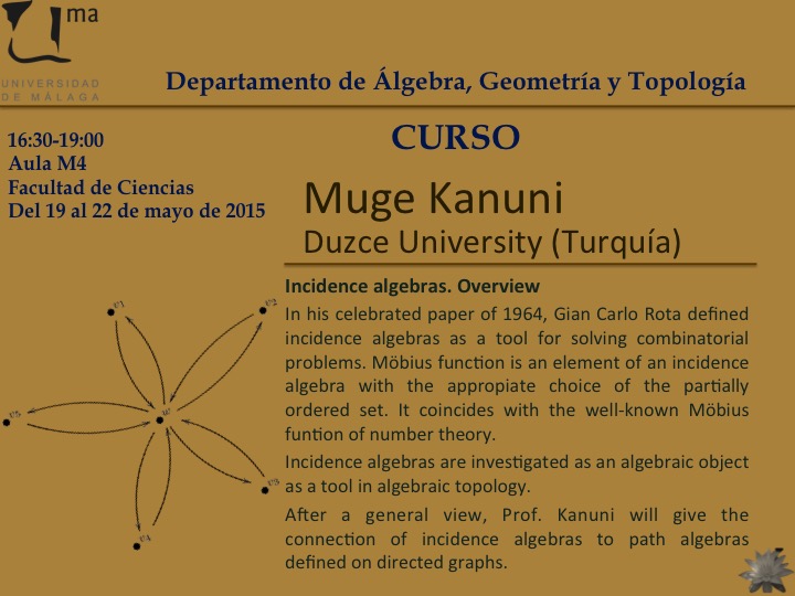 First part will be a survey of partially ordered structures; construction of incidence algebras; incidence subalgebras and applications(eg. formal power series ring, Dirichlet series, Riemann zeta function). Then connections between combinatorics and incidence algebras will be mentioned. (eg. Möbius function)
