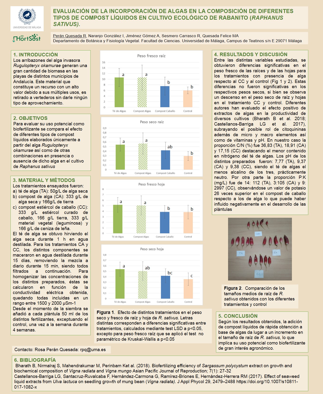 Los arribazones del alga invasora Rugulopteryx okamurae generan una gran cantidad de biomasa en las playas de distintos municipios de Andalucía. Sin embargo este material con gran potencialidad de usos es retirado a vertederos sin darle ningún tipo de aprovechamiento. Para evaluar su uso potencial como biofertilizante se compara el efecto de diferentes tipos de compost líquidos (en presencia y ausencia del alga R. okamurae) en el cultivo de Raphanus sativus. El ensayo se realizó en el huerto docente de la Universidad de Málaga, durante un ciclo de 4 semanas, siendo los tratamientos: té de alga (TA) a una concentración de 50g/L de alga seca; compost de alga (CA) con 333 g/L de alga seca y 166g/L de tierra y compost estiércol de caballo (CC) con 333 g/L estiércol curado de caballo, 166 g/L tierra, 333 g/L material vegetal (leguminosa) y 166 g/L de ceniza de leña. Para homogenizar las concentraciones de los distintos preparados, éstas se calcularon en función de la conductividad eléctrica obtenida, quedando todas incluidas en un rango entre 1500 y 2000 µSm-1. Entre las distintas variables estudiadas, se obtuvieron diferencias significativas en el peso fresco de las raíces y de las hojas para los tratamientos con presencia de alga respecto al CC y al control. Según los resultados obtenidos, la adición de compost líquidos de rápida obtención a base de algas da lugar a un incremento en el tamaño de raíz de R. sativus, lo que implica su uso potencial como biofertilizante de gran interés agronómico.